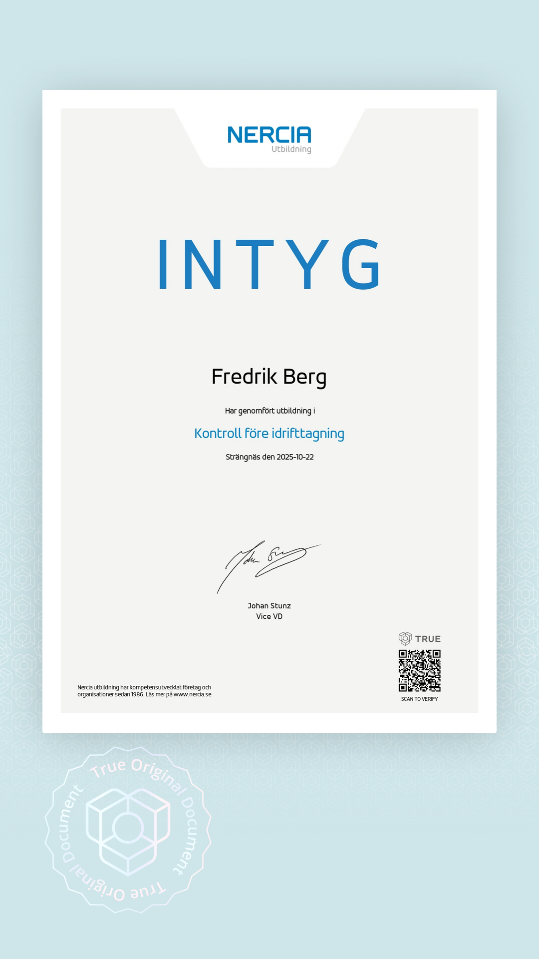 Alla TRUE -document är säkrade med blockchain-teknologi och kan verifieras som äkta. Klicka på verifieringsknappen bredvid dokumentet eller skanna QR-koden med din smartphones kamera. Ingen app krävs - dokumentets äkthet verifieras omedelbart.
