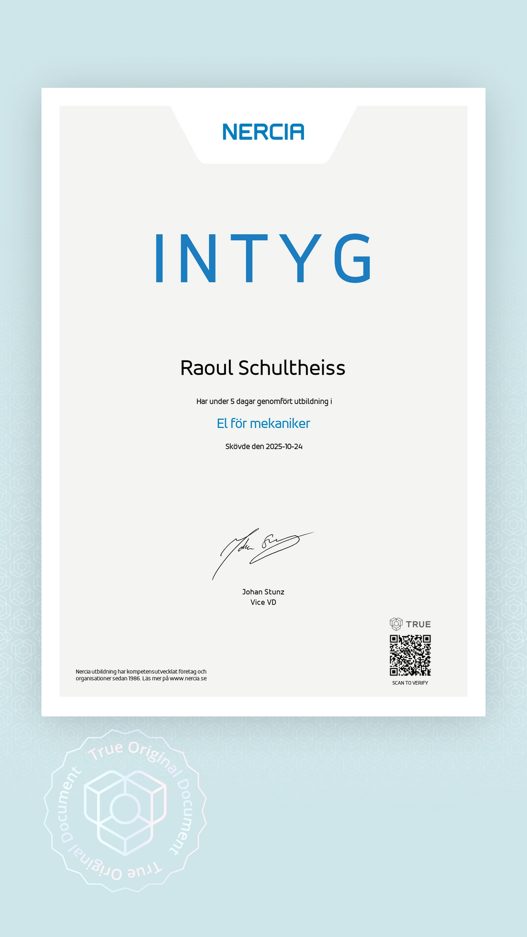 Alla TRUE -document är säkrade med blockchain-teknologi och kan verifieras som äkta. Klicka på verifieringsknappen bredvid dokumentet eller skanna QR-koden med din smartphones kamera. Ingen app krävs - dokumentets äkthet verifieras omedelbart.