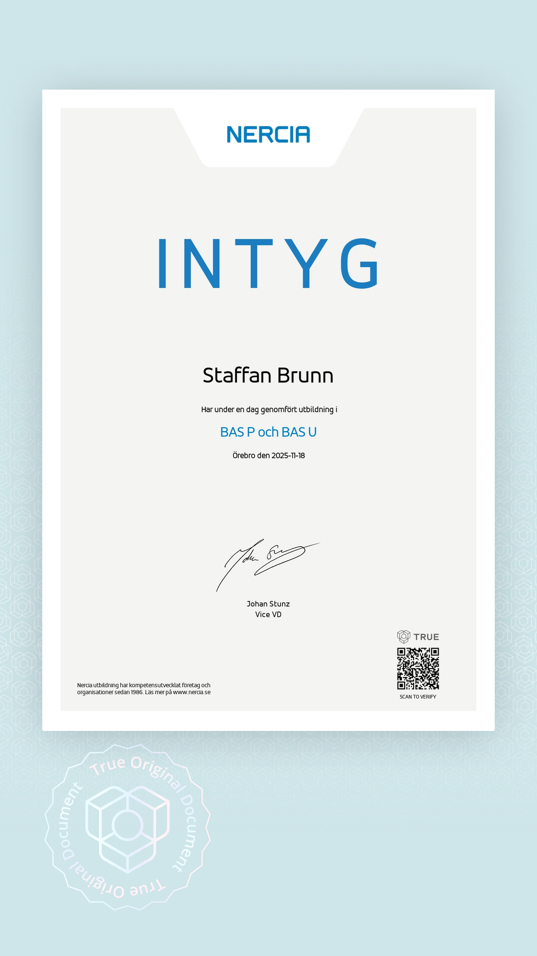 Alla TRUE -document är säkrade med blockchain-teknologi och kan verifieras som äkta. Klicka på verifieringsknappen bredvid dokumentet eller skanna QR-koden med din smartphones kamera. Ingen app krävs - dokumentets äkthet verifieras omedelbart.